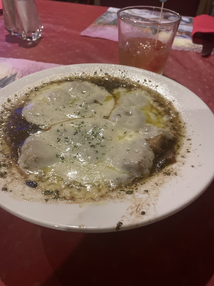 French onion soup is a popular starter among guests. Rich and savory, it is topped with melted cheese and served hot, making it a comforting beginning to any meal.